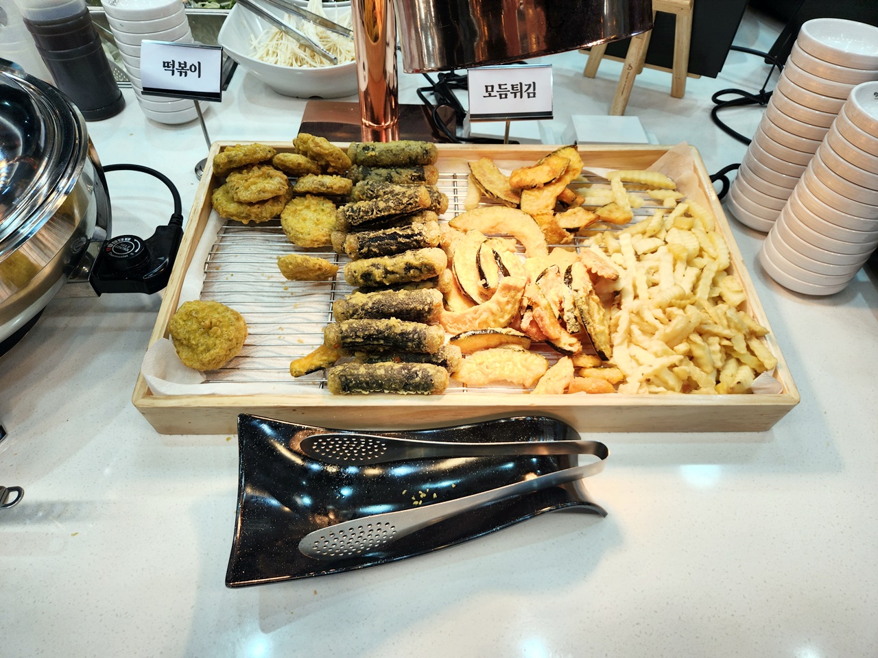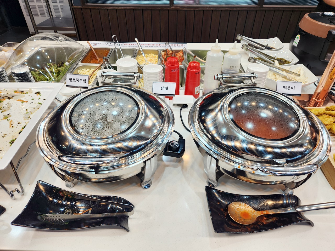 셀프바에는 보시는 것처럼 잡채, 떡볶이, 간단한 튀김류가 있습니다.