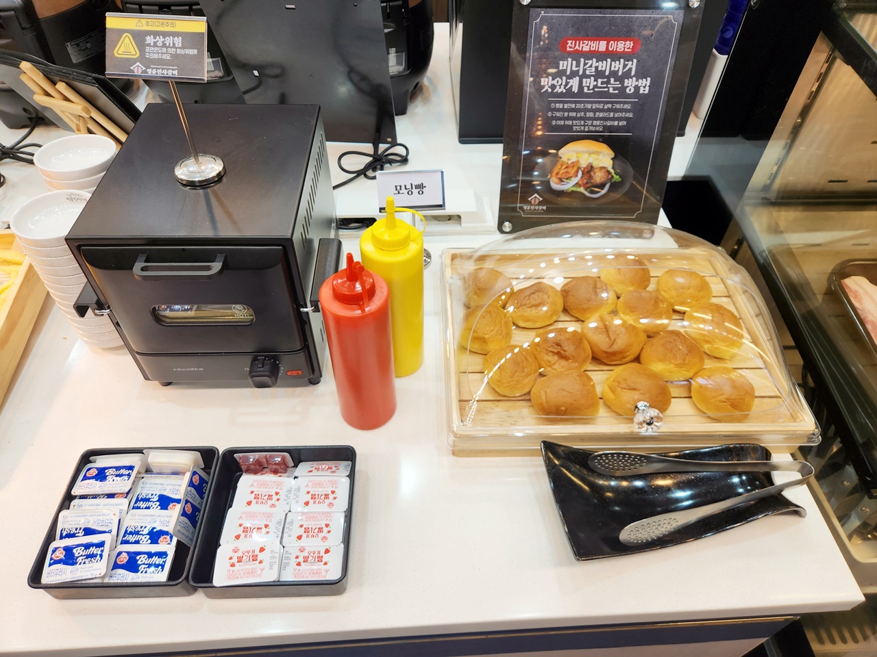 모닝빵을 왼쪽에 있는 미니 오븐에 구우셔도 되고 불판에 직접 구우셔서 제공되는 버터, 잼과 함께 드셔도 괜찮습니다.